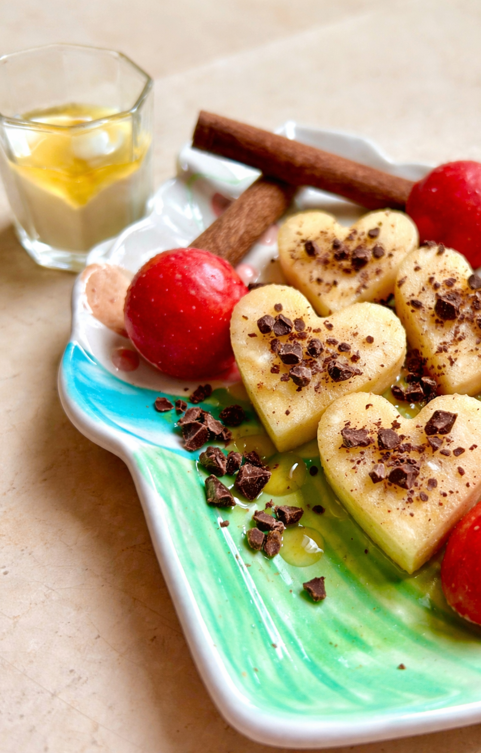 - Enfin, servez vos pommes en cœur avec un pot de yaourt au miel et à la cannelle, pour apporter encore plus de gourmandise à votre dessert.