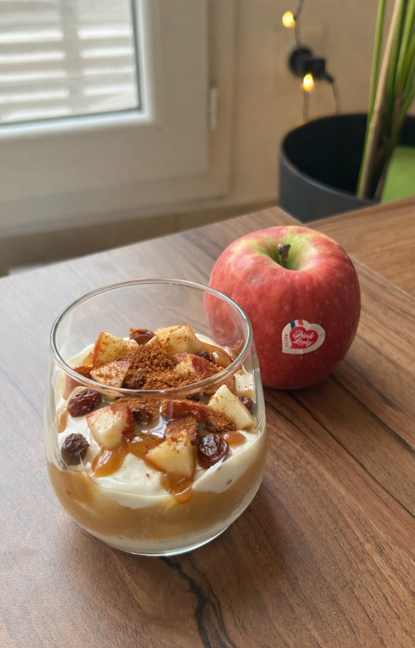 - Dans un récipient superposé une couche de yaourt nature, un filet de caramel, quelques morceaux de pommes et une dernière couche de yaourt.